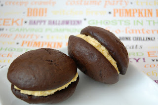 This month’s Cookie Carnival recipe is for pumpkin whoopie pies. When I saw the email, I thought they’d be Pumpkin with a cream cheese filling. I’ve seen quite a few recipes floating around for those. But these are chocolate cookies with pumpkin filling. That way they’re black and orange for Halloween π The recipe is from Martha and you can even watch her make them with Cookie Monster here.