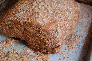 Massage spice rub into meat (I recommend doing this on a jelly roll pan or large cookie sheet with sides). Wrap tightly in double layer of plastic wrap; refrigerate for at least 3 hours. For stronger flavor, the roast can be refrigerated for up to 3 days. (I refrigerated ours for 2 days).