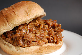 I rubbed the meat 2 days prior to cooking it and it cooked on low in the crockpot for about 10 hours. When we took it out to pull apart, it was very tender and flavorful. We were tempted to eat it then, but we stuck to the recipe and added the BBQ sauce and threw it back in for another 45 minutes or so.