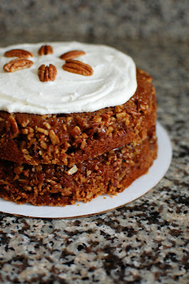 I made this cake to take to a friend’s house on Thanksgiving evening. We were getting together for desserts, wine, and board games. This cake was the star of the evening. The pumpkin cake layers were perfectly spiced and moist. The praline topping that is baked into the cake gives a great crunch and nuttiness. Last, the spiced whipped cream topping ties it all together.