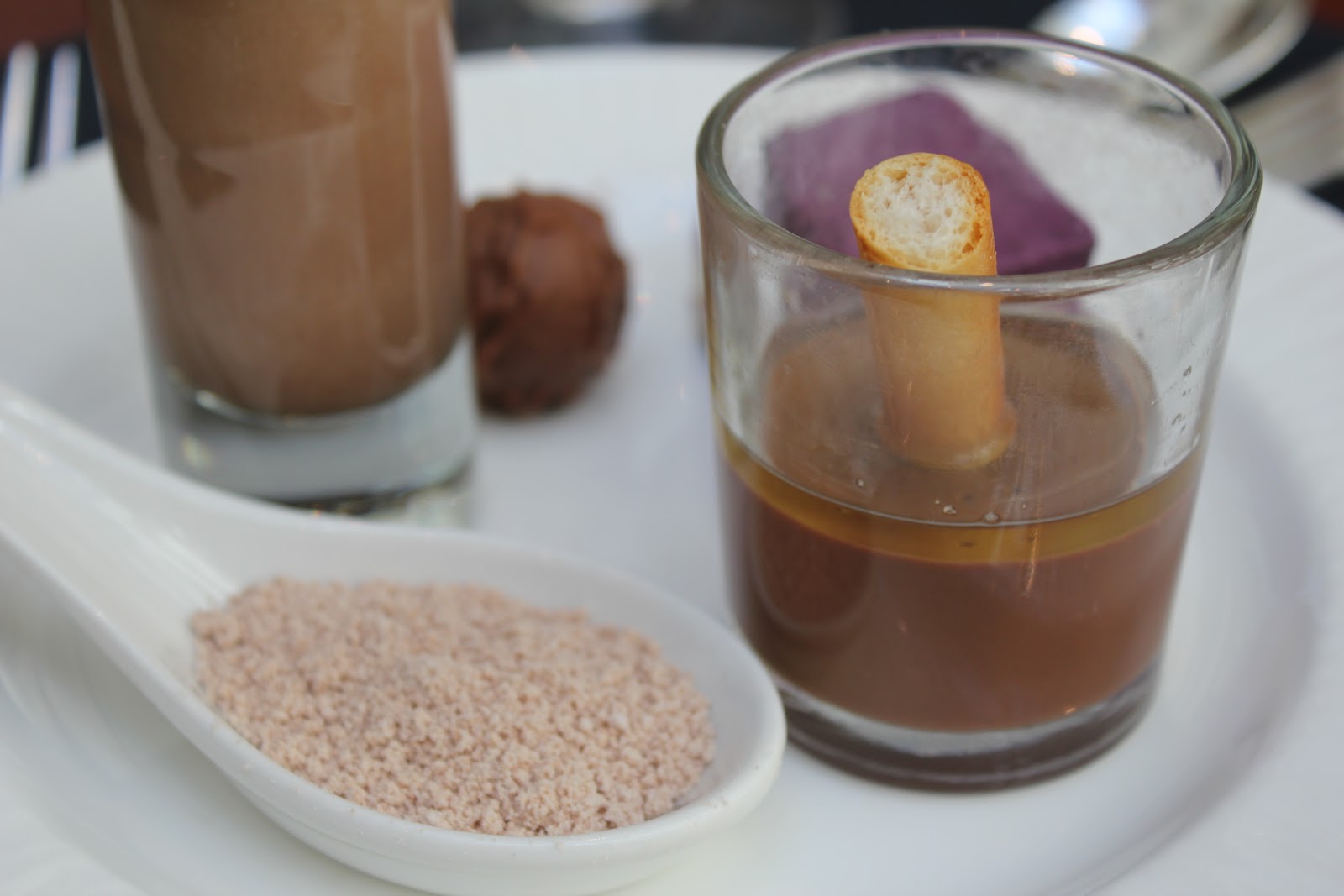 I also could not resist the spoonful of powdered chocolate, but this was a bit of a miss – not sure what the goal of this dish was. The shot glass in the background had a delicious hot chocolate with a spicy kick that was fun and delicious! That last dish on this plate was my favorite of the entire afternoon – chocolate mousse with a layer of olive oil garnished with a salty breadstick. The olive oil here was the star of the dish. It added a surprising richness that you thought would be overkill but wasn’t at all and added a whole other dimension to the dish! The breadstick just provide the perfect vehicle to get it into my mouth faster 😉