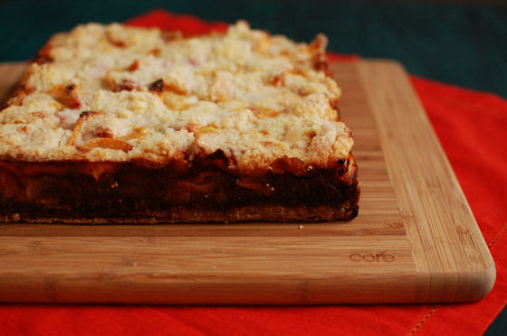I left the skin on the peaches for two reason. For one, it makes the recipe a whole lot easier. Second, the skin provides a subtle tartness that you lose when you peel peaches. I baked these on a Thursday night, cut them up and put them in a tupperware container to take to work. Then, wouldn’t you know it, I left the container on the counter. So my coworkers didn’t get to try them. These bars are a great way to highlight any fruit that you have in season.